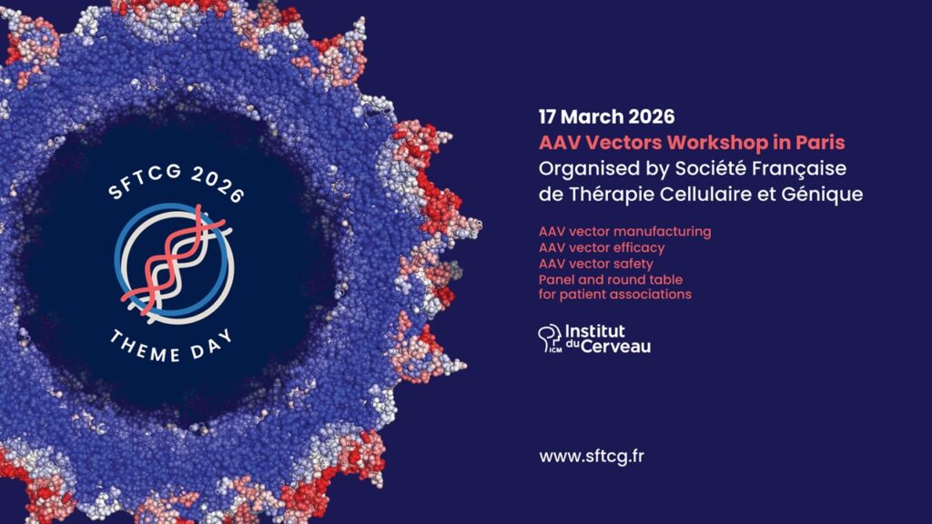 The Theme Day on AAV Vectors organised by SFTCG will take place at Institut du Cerveau (Paris) on 17 March 2026. The day will focus on the manufacturing and therapeutic use of AAV gene-therapy vectors, bringing together researchers and industry to discuss the latest findings and developments. It offers a platform for knowledge-sharing, poster/oral presentations and fostering collaborations in the field of AAV gene therapy. In the evening, a roundtable discussion will also be held with patient associations, providing an opportunity for dialogue on expectations, challenges and future perspectives in AAV-based therapies.