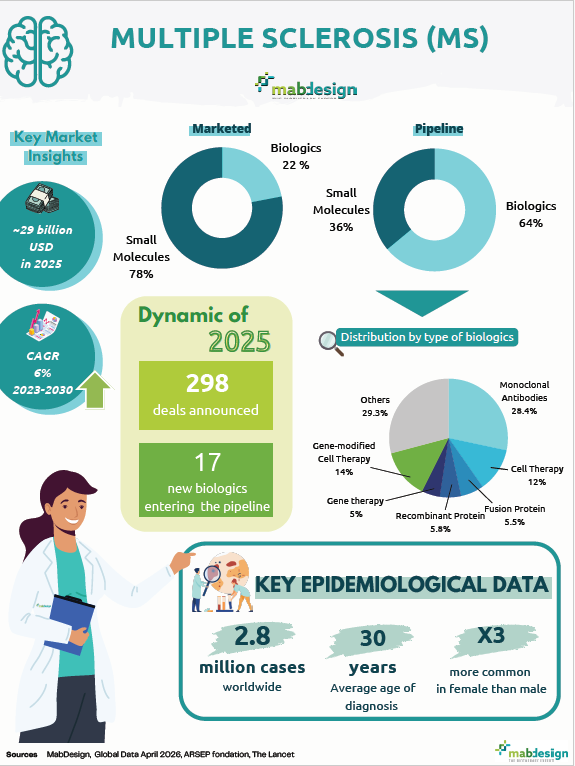 Les analyses marché de MabDesign vous donnent chaque mois un aperçu de la dynamique marché et des projets en développement sur une indication ou une technologie donnée, pour vous aider à mieux comprendre le marché en constante évolution des biomédicaments et de la bioproduction. Ce mois-ci, un aperçu des projets actuellement en développement pour la prévention et le traitement de la Sclérose en Plaques (SEP).